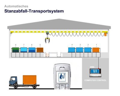 Das vollautomatische Transportsystem nimmt Wagen mit Stanzabfällen, erkennt automatisch die Stanzabfall-Sorte und entleert den Wagen über dem dazu gehörenden Container Das Stanzabfall-Gewicht und die Füllhöhe der Container werden automatisch ermittelt.