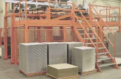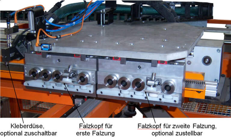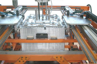 Die Anlage verbindet Wärmetauscherplatinen durch luftdichtes falzen. Zwei Roboter legen die Platinen zwischen die Falzbaugruppen