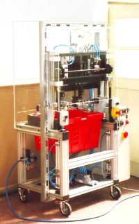 Vorrichtungen, Maschinen und Anlagen zur Baugruppenmontage bauen wir genau nach Kundenwunsch. Montage von Bügeln und Reflektoren an Transportboxen für automatische Hochregallager.