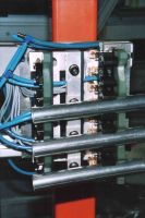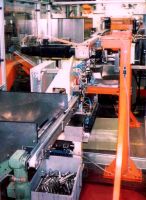 Handlinganlage zum Beschicken einer Spritzgießmaschine. Metallhülsen für Stiele von Gartengeräten werden vereinzelt. Ein Vierfachgreifer legt die Metallhülsen in eine Spritzgießmaschine ein und entnimmt sie nach dem Spritzgießen.